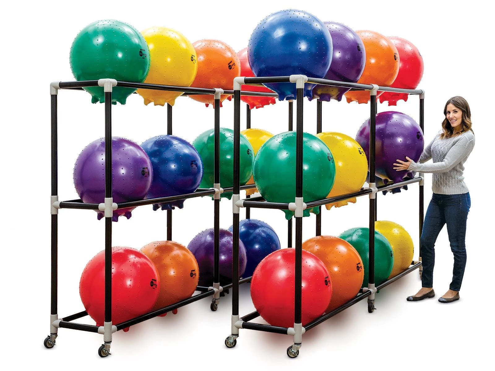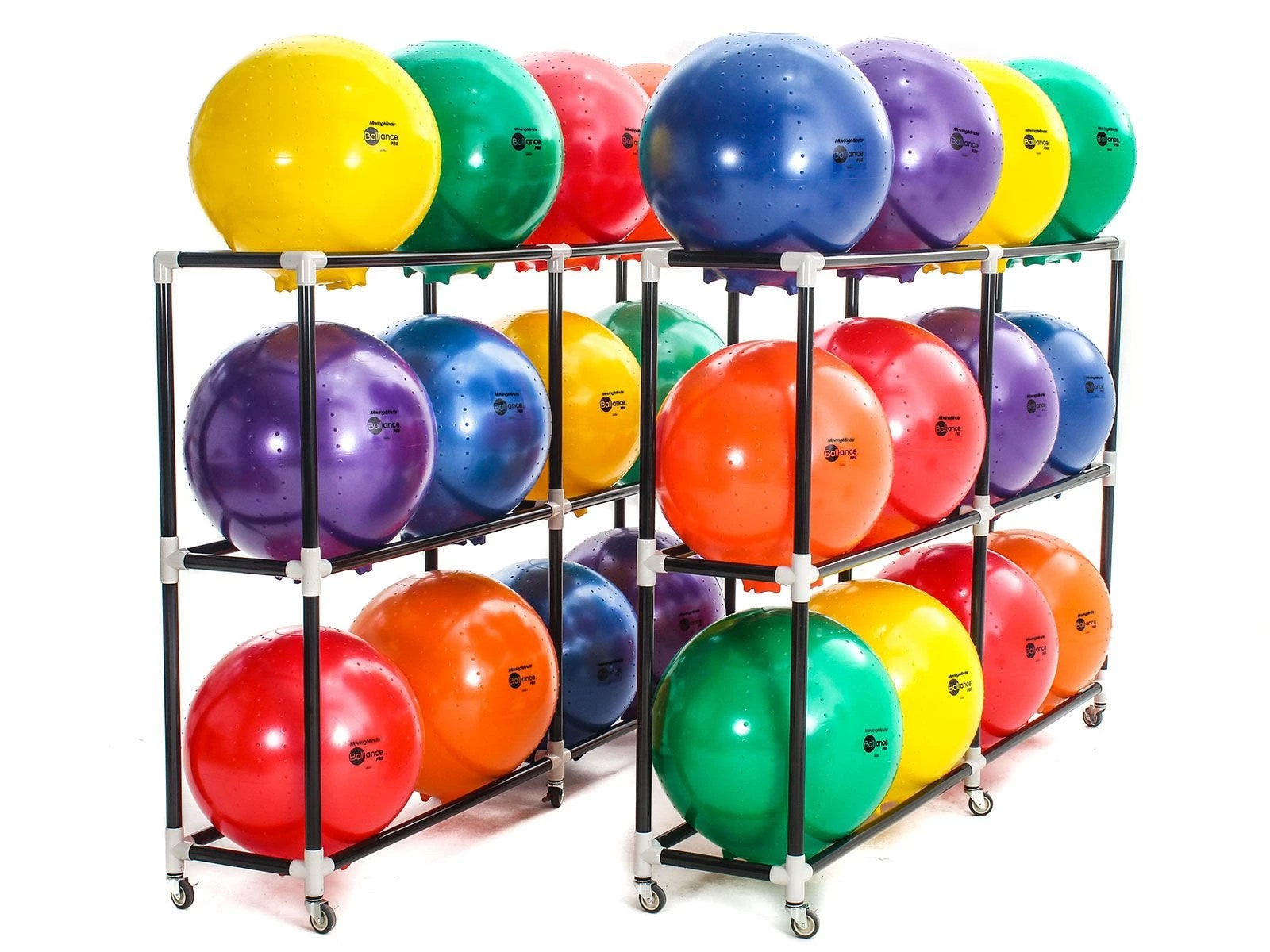Packs are available in original BALLance or BALLance Pro Balls with twice the thickness for enhanced durability. All packs also include 1 or 2 racks to store the ball chairs. Durable, ABS racks have an open design for easy access and include six 3″ dia swivel casters for easy movement around the school whether it’s in, to, or from the classroom. Lock the casters to keep the rack and balls in place and out of the way when not in use. Assembly is required on the rack. The rack is 107″L x 19-1/2″W x 68-1/2″H; 46 lb.