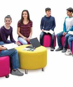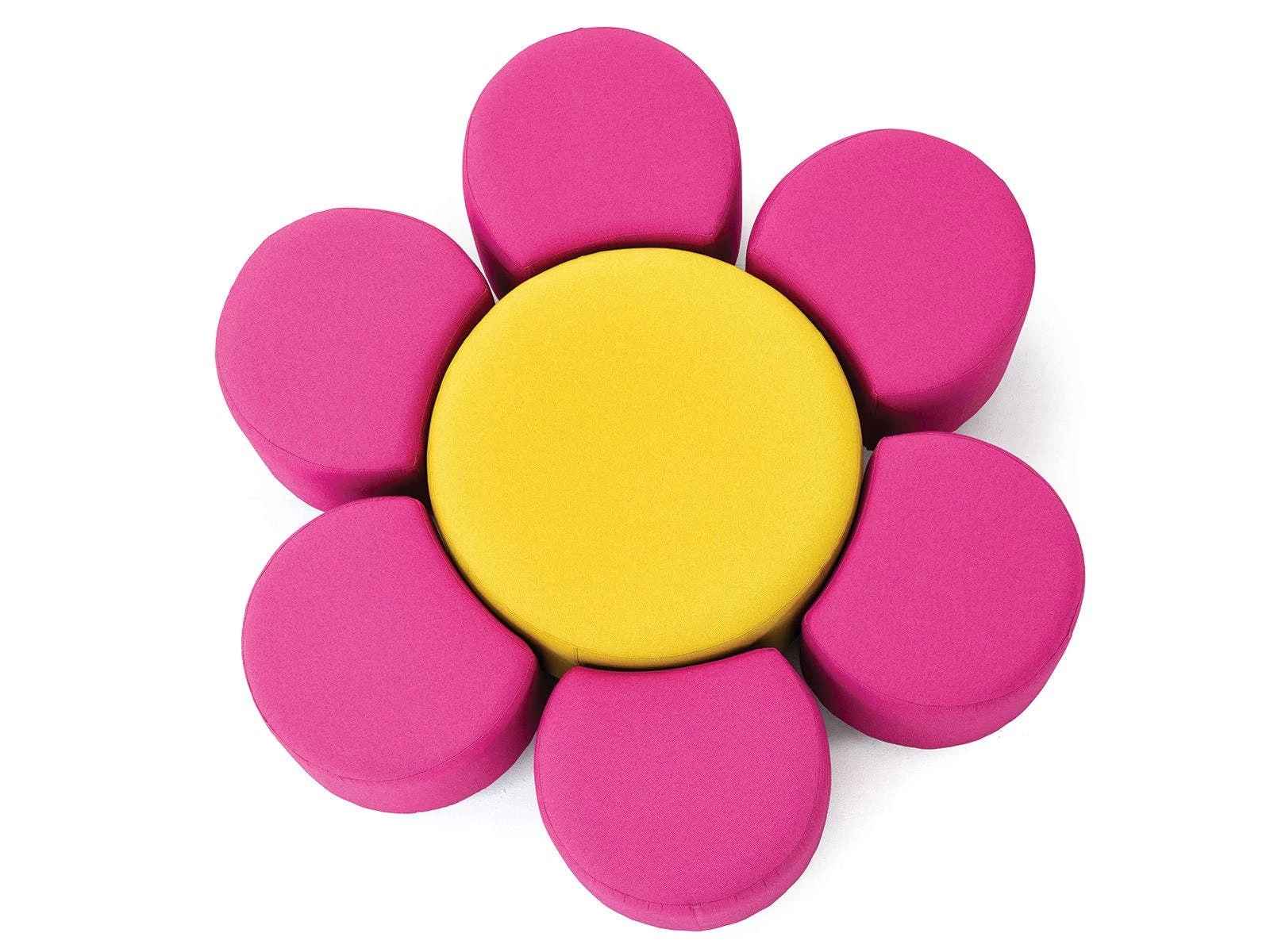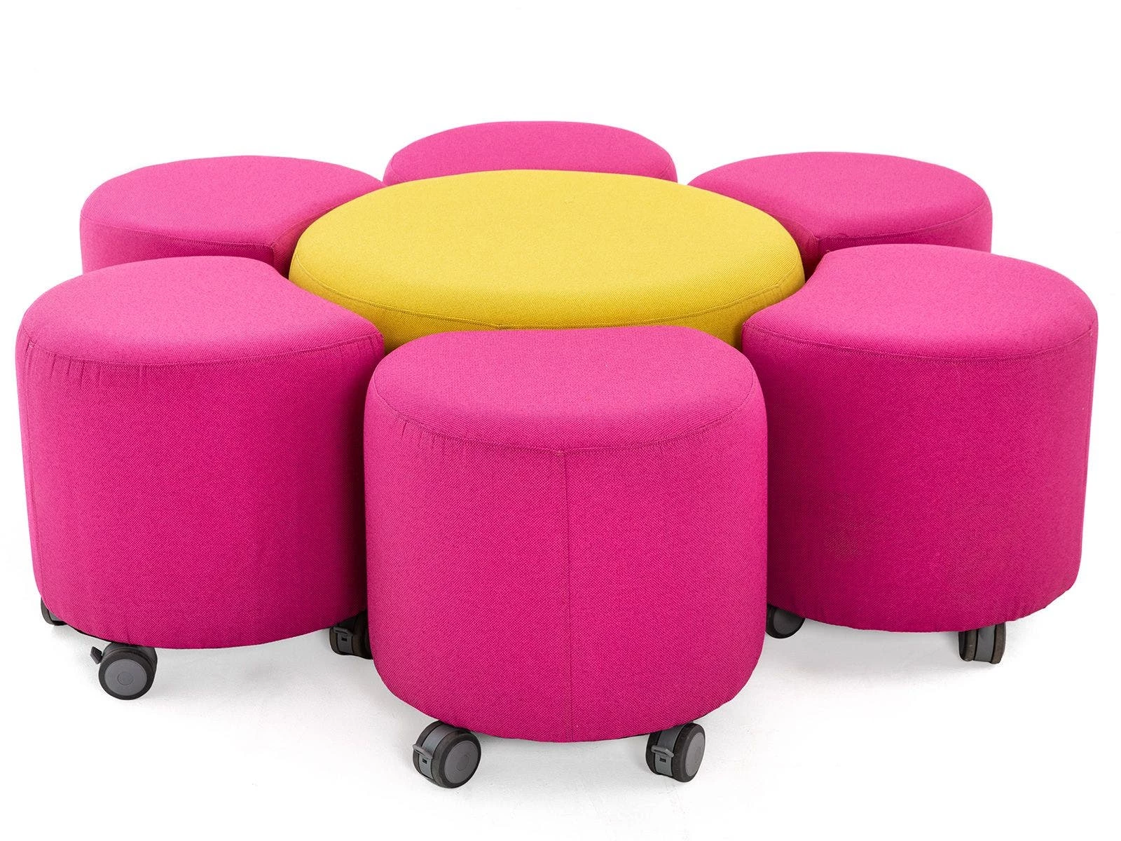 Wooden frame adds stability, while the high-density foam and durable fabric cover adds comfort. The larger center stool has aluminum legs, while the smaller petal stools include locking casters so students can move them to another spot in the classroom. Each set includes a yellow center stool (18″H x 30″dia; 28 lb) and 6 pink petal stools (20″L x 18″W x 18″H; 22 lb ea). Each stool supports up to 400 lb and requires minimal assembly.