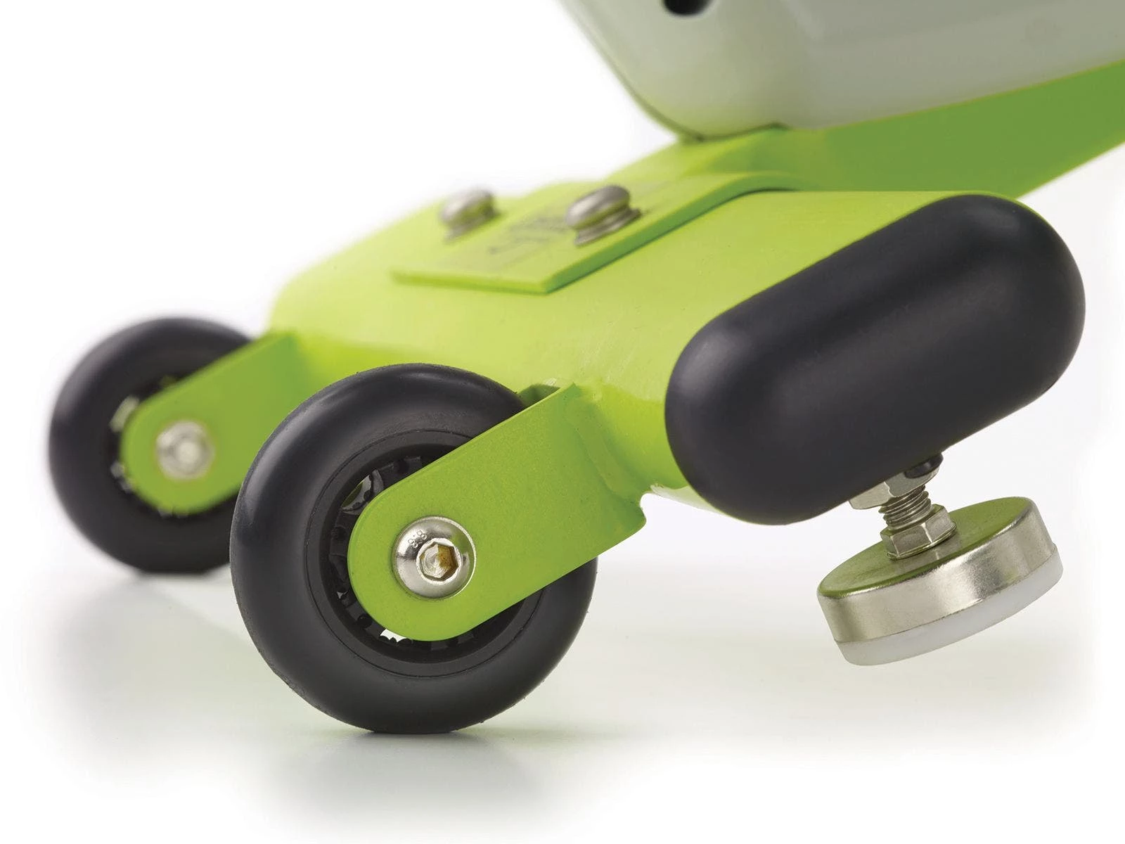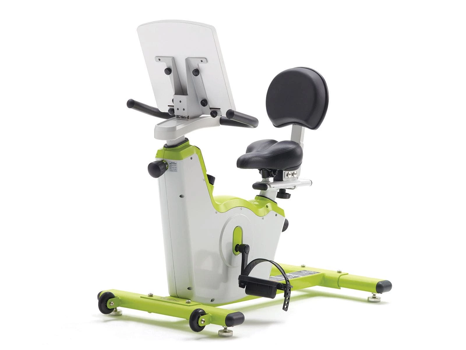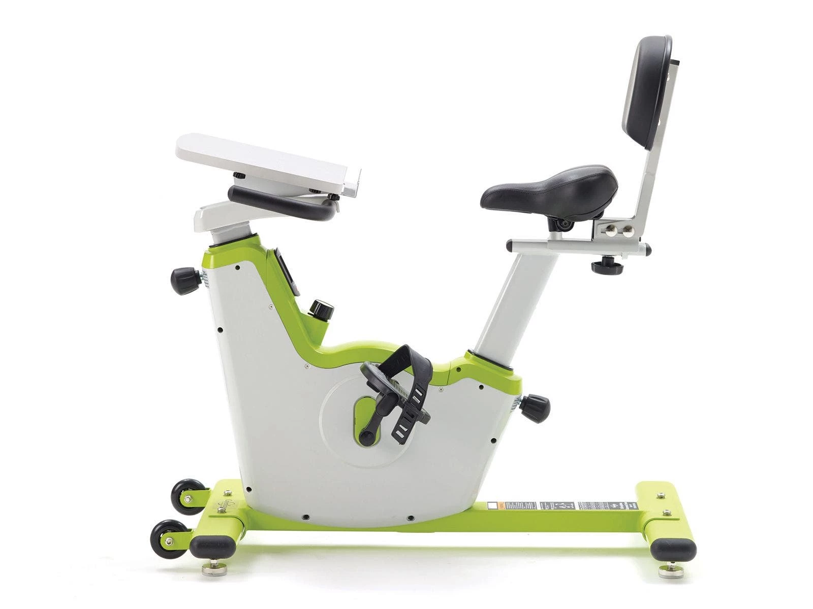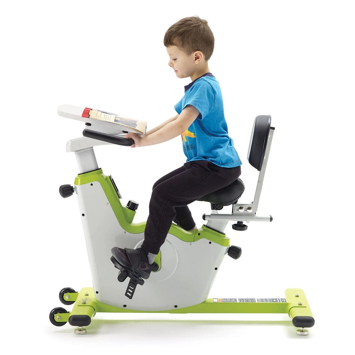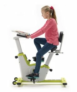 Bike frame is made of powder-coated steel for enhanced durability. A covered flywheel prevents pinched fingers. Levelers ensure bike sits evenly on the floor. Desktop (11-3/4”L x 11-1/2”W) is made of hard-wearing MDF board. Tip and roll the bike on two 3” dia built-in casters for easy relocation between use. Requires 2 AAA batteries (included) for digital display. Bikes support up to 250 lb and are 37”L x 22”W. Choose from Pre-K to Grade 2 or Grades 3 to 6.
