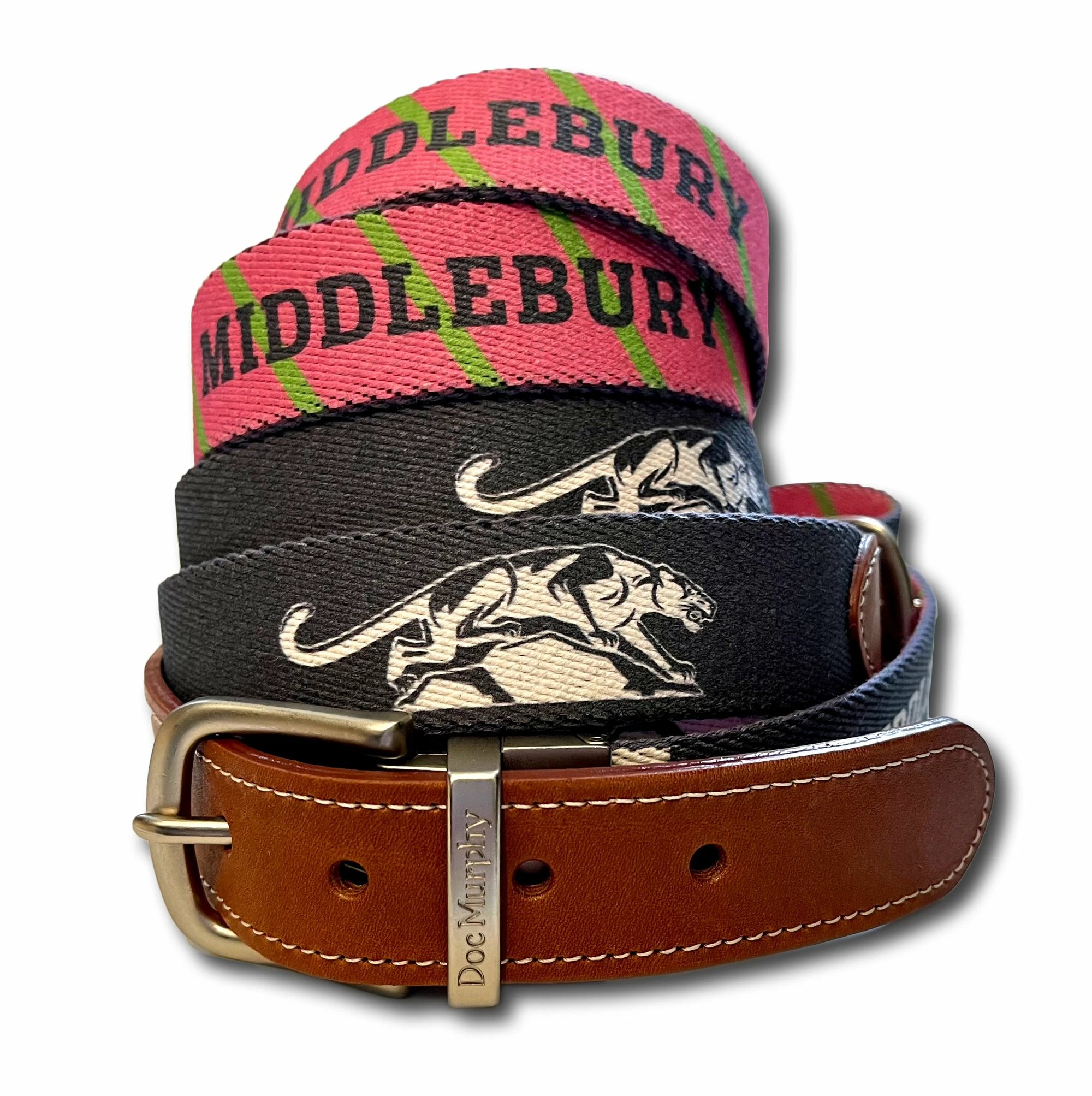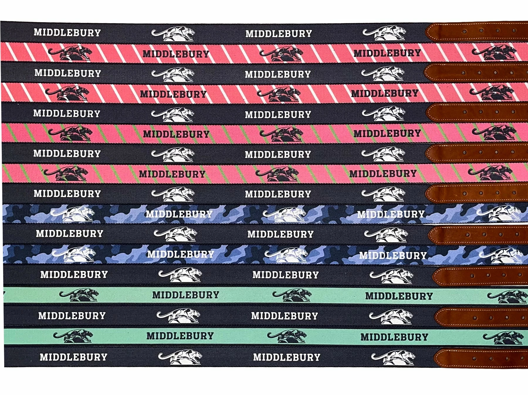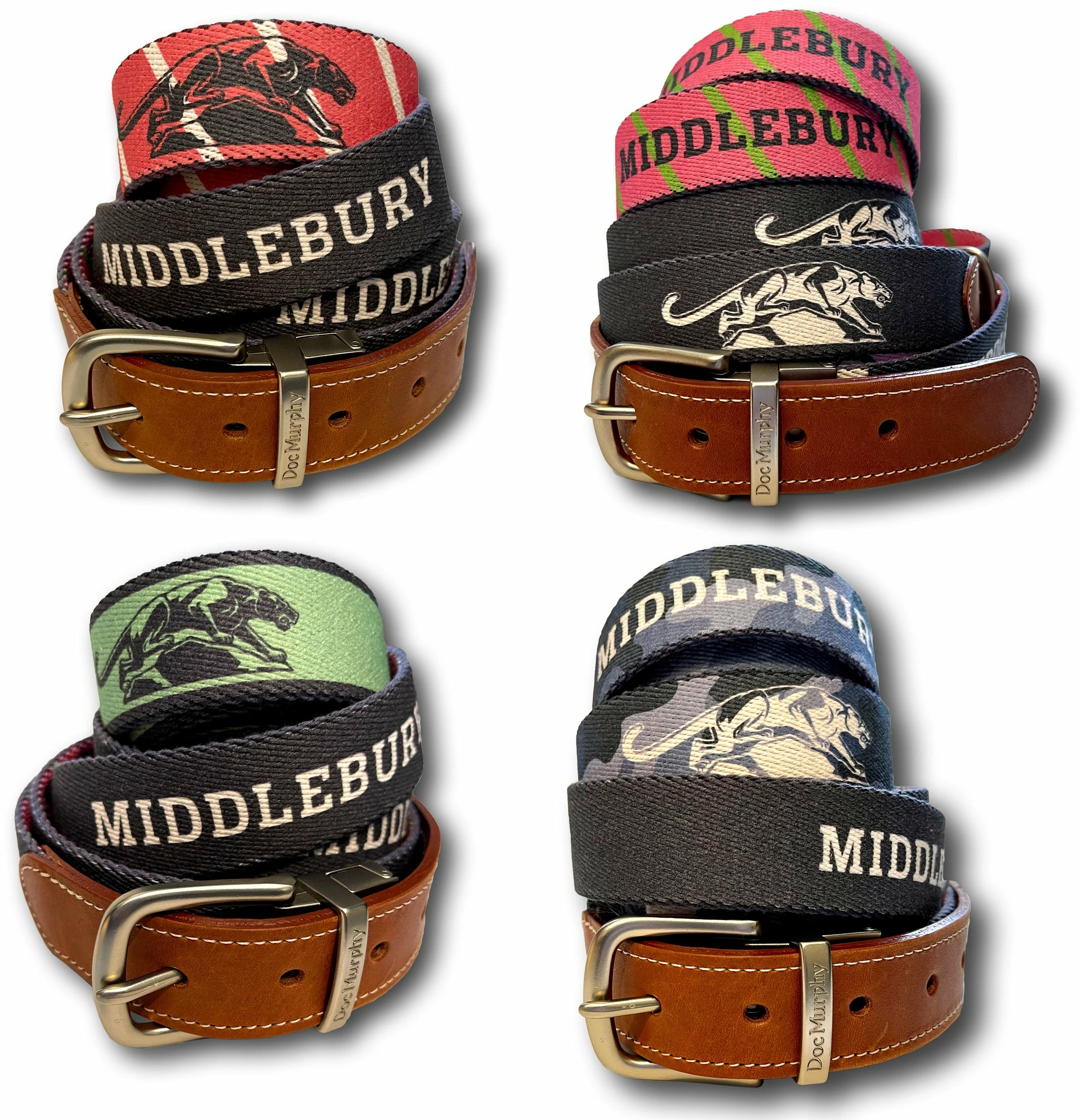 Doc Murphy’s Collection: CustomCutâ„¢ and reversible. The 1st side of each belt is the classic Middlebury College Navy with Panther logo & “MIDDLEBURY”. The 2nd side of each belt comes in 4 different options: Color/Pattern – Nantucket Striper/Yacht Rocker/Midd Camo/Snow Bowler.