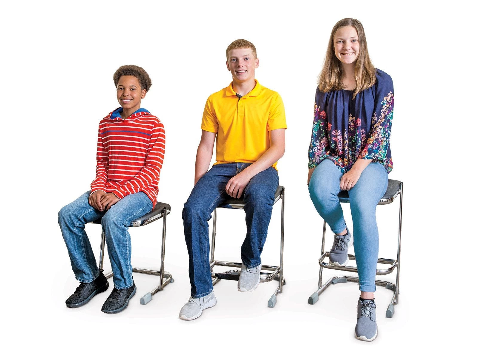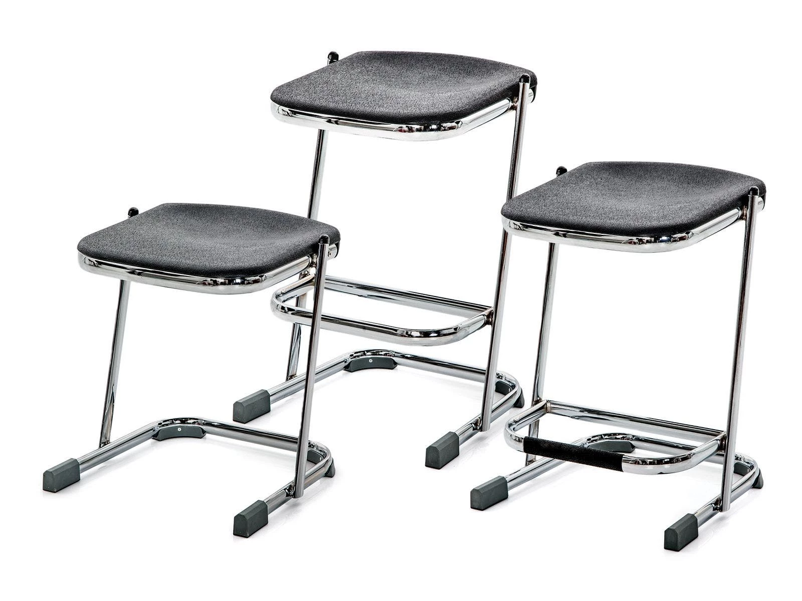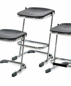 Durable chrome-plated 12 gauge steel frame stands up to continued use. U-shaped base promotes safety, while permanently attached polyurethane glides allow for quiet movement on all floors. Ergonomic, blow-molded contoured seat allows for increased comfort and promotes good posture. Save floor space after class wraps up and stack these chairs together. Supports up to 300 lb. Each seat is 16-3/4″L x 16-3/4″W. Available in Sets or 6 or individually, in 3 sizes. Small is 18″H;Â 9-1/2 lb. Medium is 22″H;Â 11-1/2 lb. Large is 24″H; 12 lb.