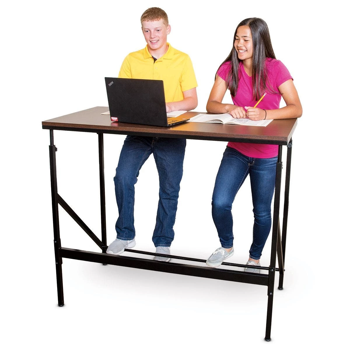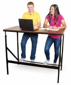 With height adjustments from 38” to 50”, this standing desk accommodates 1 to 2 students of most ages for a more active classroom experience. Constructed with a chip-resistant melamine laminate desktop and a powder-coated steel base, this desk is built for strength. A 30”W workspace gives students ample room. An included footrest provides additional support for fidgeting students. Assembly required. 48″L x 24″W x 50″H; 56-1/3 lb.