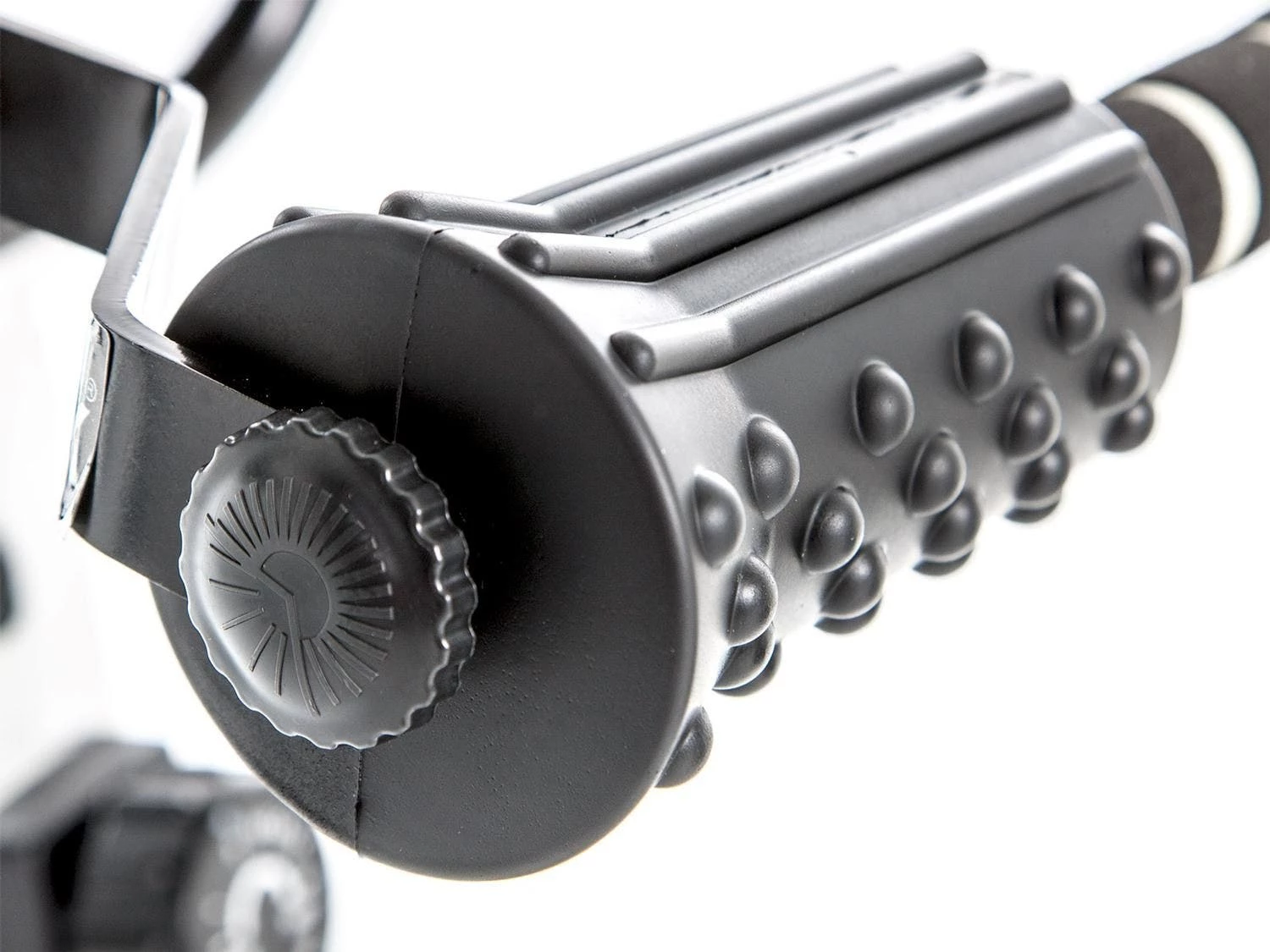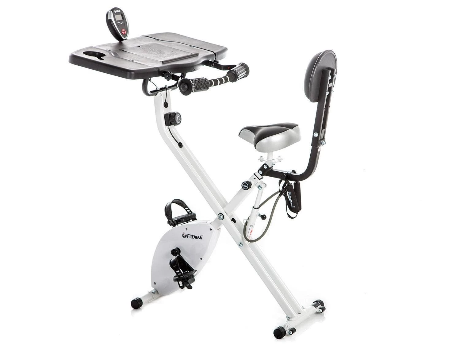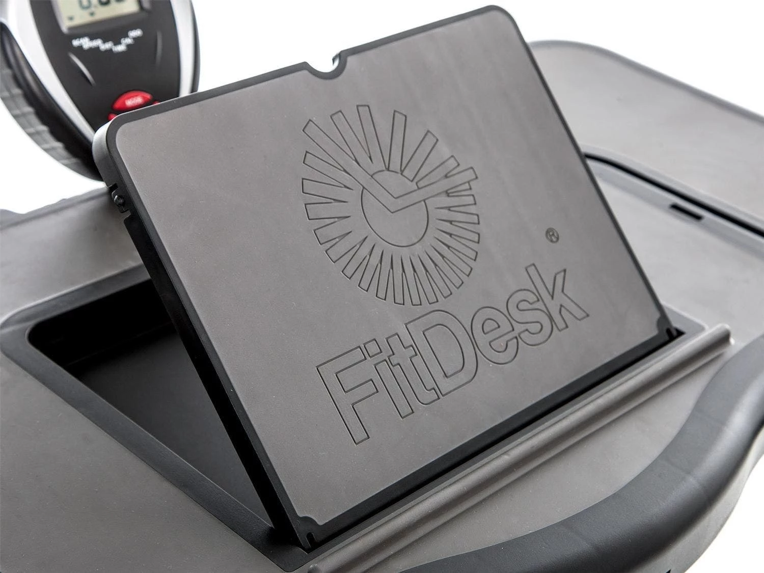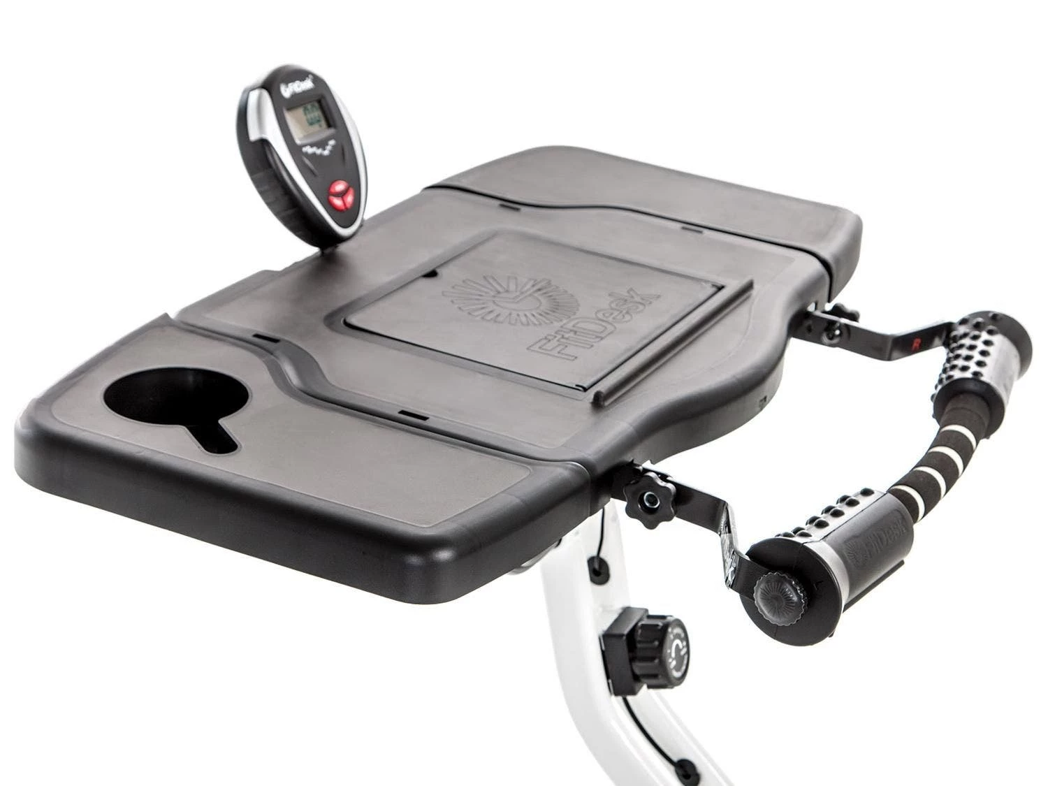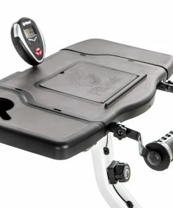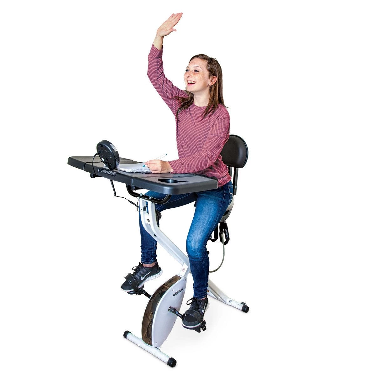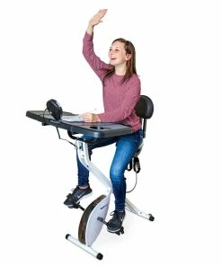 Lightweight, folding exercise bike/work station provides a comfortable ride and helps combat long periods of inactivity from sitting. Features a quiet, twin-belt flywheel operation that allows for use in classrooms or other shared spaces. Adjustable resistance levels provide the right ride for a variety of ages, and easy-adjust saddle with extender maximizes comfort and ensures a proper fit. A 16″ x 19″ sliding desk area allows hands to rest in a natural position while extended, adjustable arm rests with contoured padded rollers offer comfort and support. The desk also features a built-in tablet holder. Console provides continuous feedback, displaying distance, calories, and time. Available Extension Kit doubles the surface area, providing extra space to comfortably use a mouse or tablet. User weight limit 250 lb; recommended for users 4’10” and up. Assembly required. 28″L x 16″W x 45″H; 47 lb.