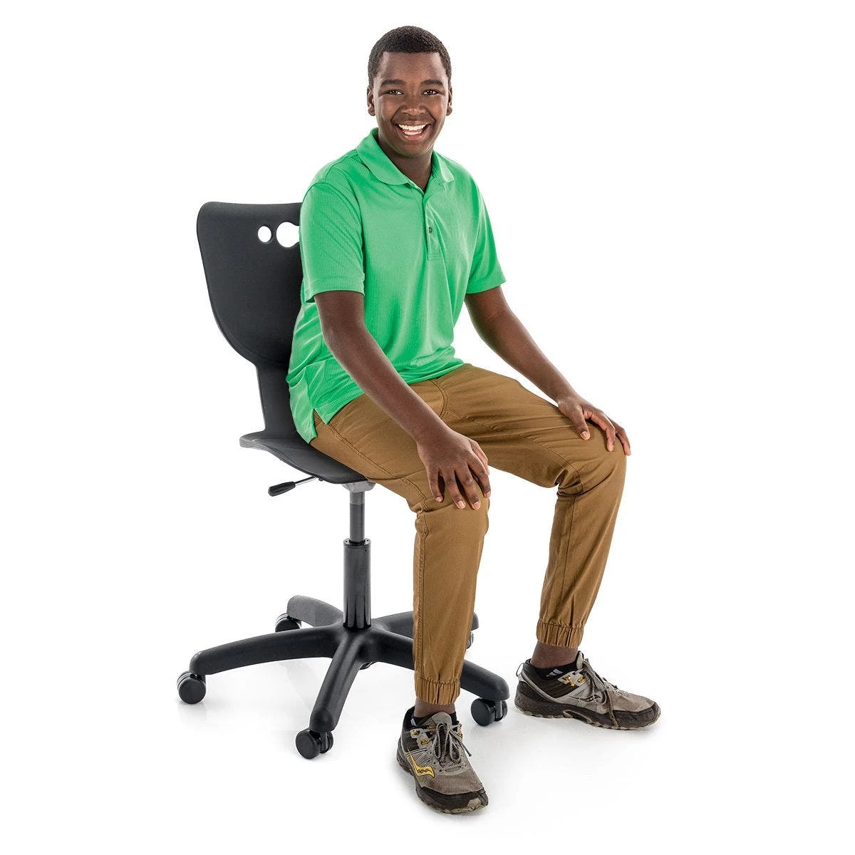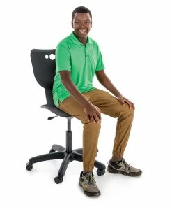 The reinforced back on this stool provides lumbar support and flexes without causing sharp, uncomfortable edges as students lean back. They can use the attached lever to adjust the seat height from 23″ to 33″H to accommodate several heights.