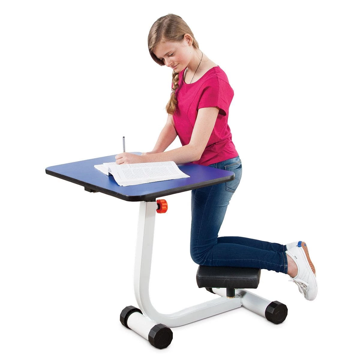 From a kneeling position, students engage their external oblique and central core muscles in a gentle rotational movement to help diffuse extra energy, increase focus, and improve posture. Contoured kneeling pad ensures proper positioning; pivots on commercial-quality, self-oiling bearing system for guaranteed smooth, quiet motion that will last for years. Powder-coated steel frame with scratch-resistant leveling feet. Institutional-quality, laminate desktop adjusts from 24″ to 34″H. User weight limit 300 lb.