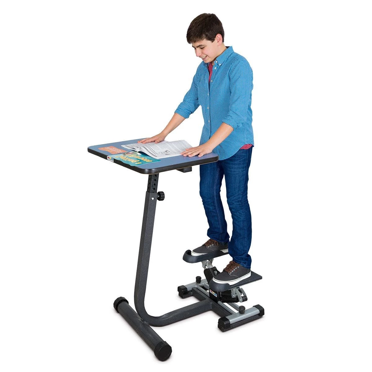 Offers steady, non-variable resistance against a hydraulic action lever to emulate stair climbing. This more intense range of motion can really get the heart pumping! Laminate18″x28″ desktop adjusts from 36″ to 48″H to provide a comfortably accessible and durable work area for a wide range of students. Sturdy steel frame with chip-resistant, powder-coated finish keeps looking great for years. Adjustable floor levelers ensure stable positioning; scratch-resistant feet won’t mar floors. User weight limit 300 lb; recommended for ages 10-18. Fully assembled. 28″L x 30″W x 36″H; 125 lb. Training and installation available on request.