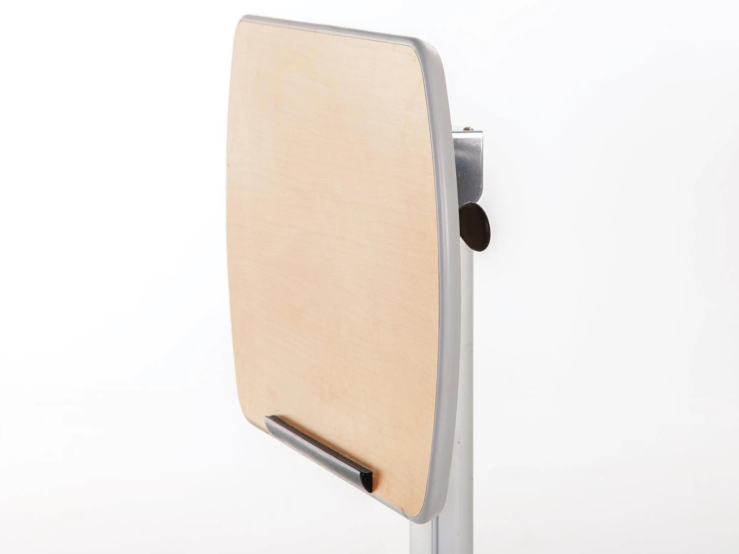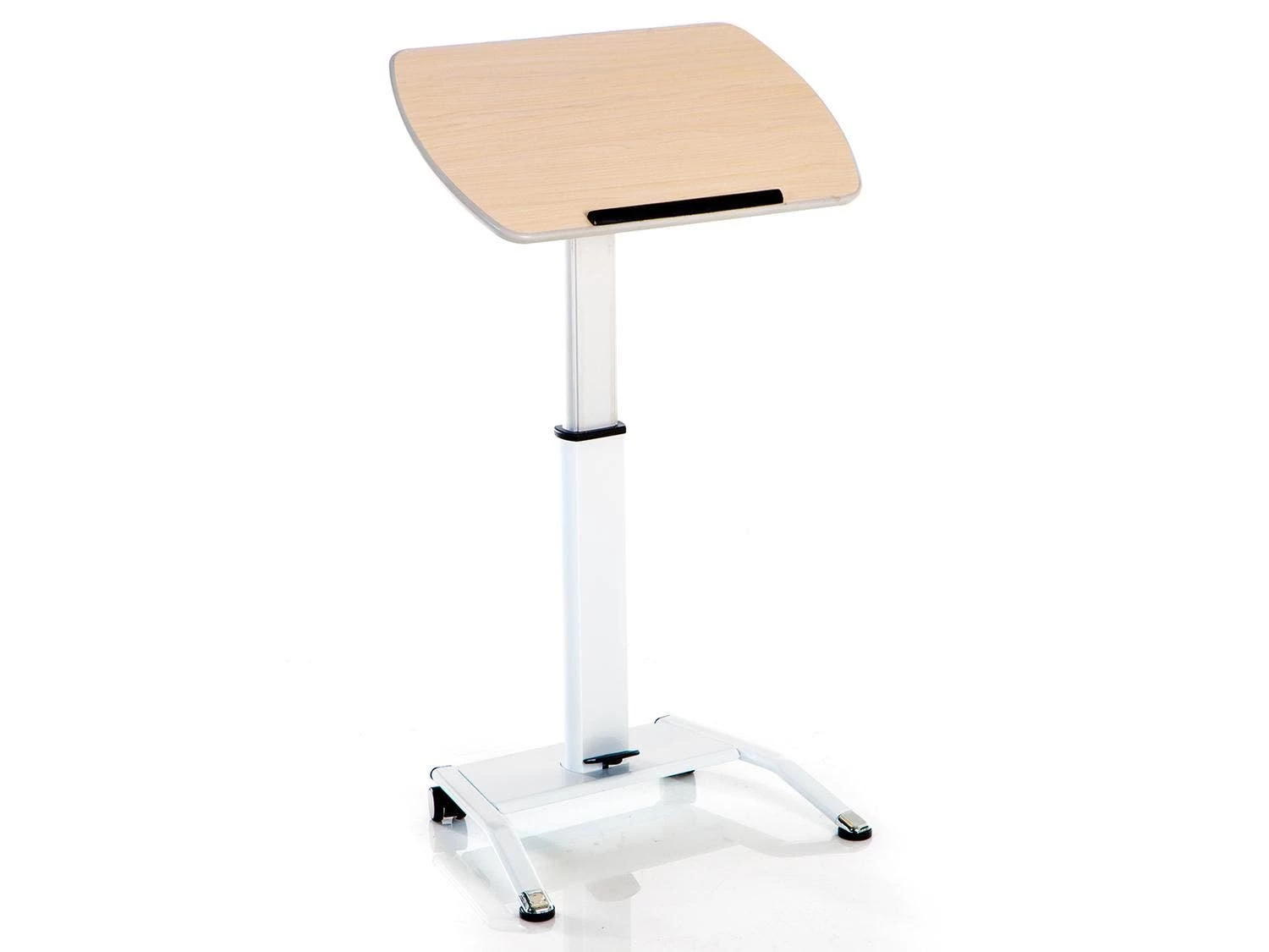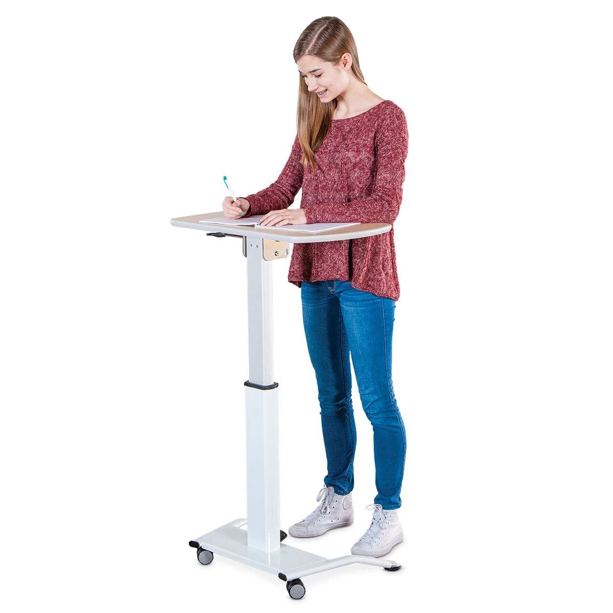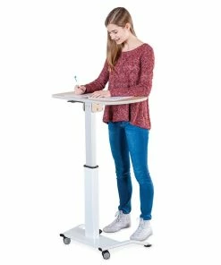 Smaller size and a lightweight design conserve space in small classrooms or offices. This compact size, plus tip-and-roll wheels, make it a breeze for almost anyone to move this desk. Angle the laminate tabletop to use it as a podium; it tilts down completely so the desk takes up even less space when not in use! Adjust the height anywhere between 26″ and 43″H for sitting or standing with a simple foot lever. Lip prevents book, pencils, and other materials from sliding off the top. 25-1/2”L x 17”W; 23 lb.
