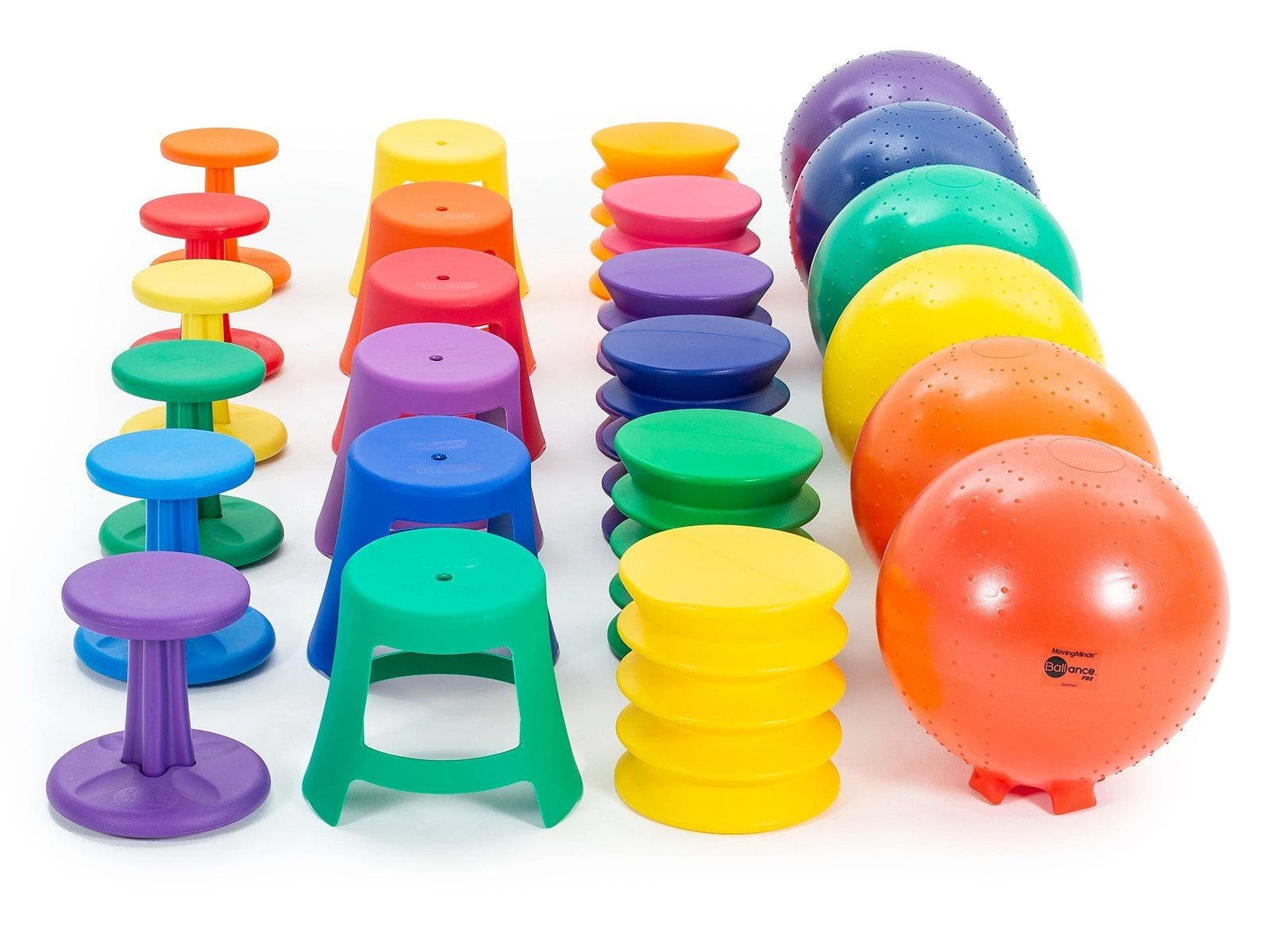 Whether students want to wobble, tilt, or bounce, this assortment of seats and chairs will keep their minds and bodies active throughout class. Convenient portability also lets students quickly swap seats without missing a beat during lessons. Kore Wobble Chairs have a rounded bottom for safe instability, while ergoErgo Seats compress slightly and provide 360° of movement. TiltED Seats let students tilt and balance to engage their core. BALLance Pro Stability Ball Chairs promote movement while sitting and include retracting feel to prevent the ball from moving when not in use. Each pack includes 6 ea ergoErgo Seats, Kore Wobble Chairs, TiltED Seats, and BALLance Pro Chairs. Choose from Elementary or Secondary for appropriate sizing. Unique colors make it easy to distinguish the Elementary and Secondary packs.