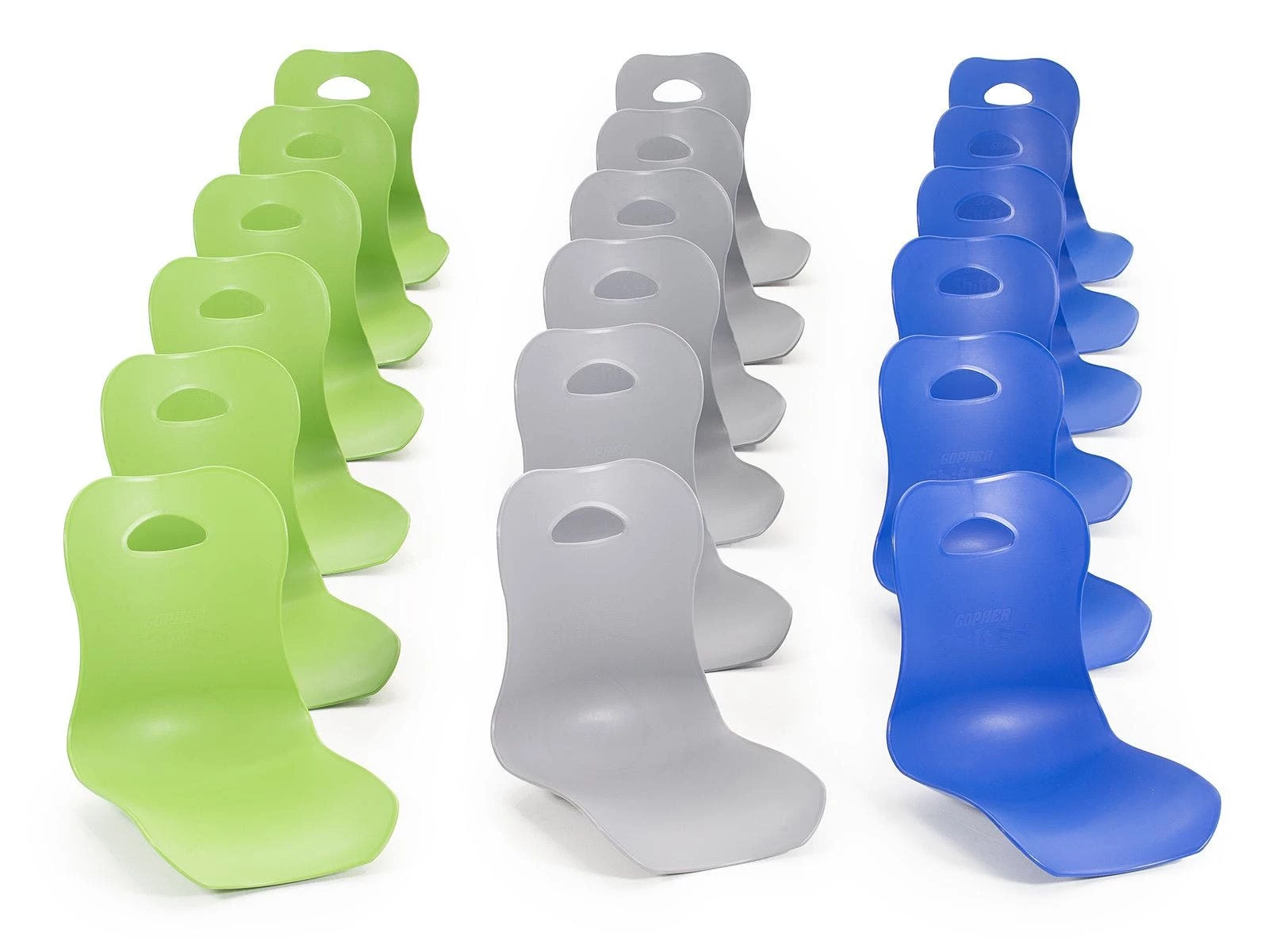 Seats include a molded-in handle for easy carrying around the classroom. Plus, they stack for compact storage when not in use. Seats support up to 250 lb and are 22″L x 16″W x 18-1/2″H; 4-1/2 lb. Set of 18 seats includes 6 ea blue, gray, and light green, allowing teachers to quickly group students according to seat color.