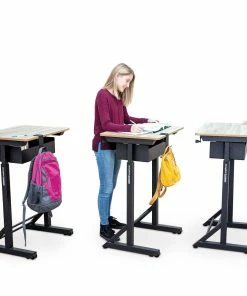 Our institutional-quality SmartStudy desks include a powder-coated steel frame with a matte black finish for long-lasting wear. The wood-colored melamine top resists wear. Desks also include leveling feet for a stable workspace. Choose from fixed-height or adjustable desks in standard or modular options. Each desk set includes a book box and storage hook. If you’re looking to update your current standing desks, the book boxes and storage hook are also sold separately. Assembly required.
