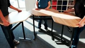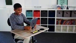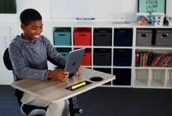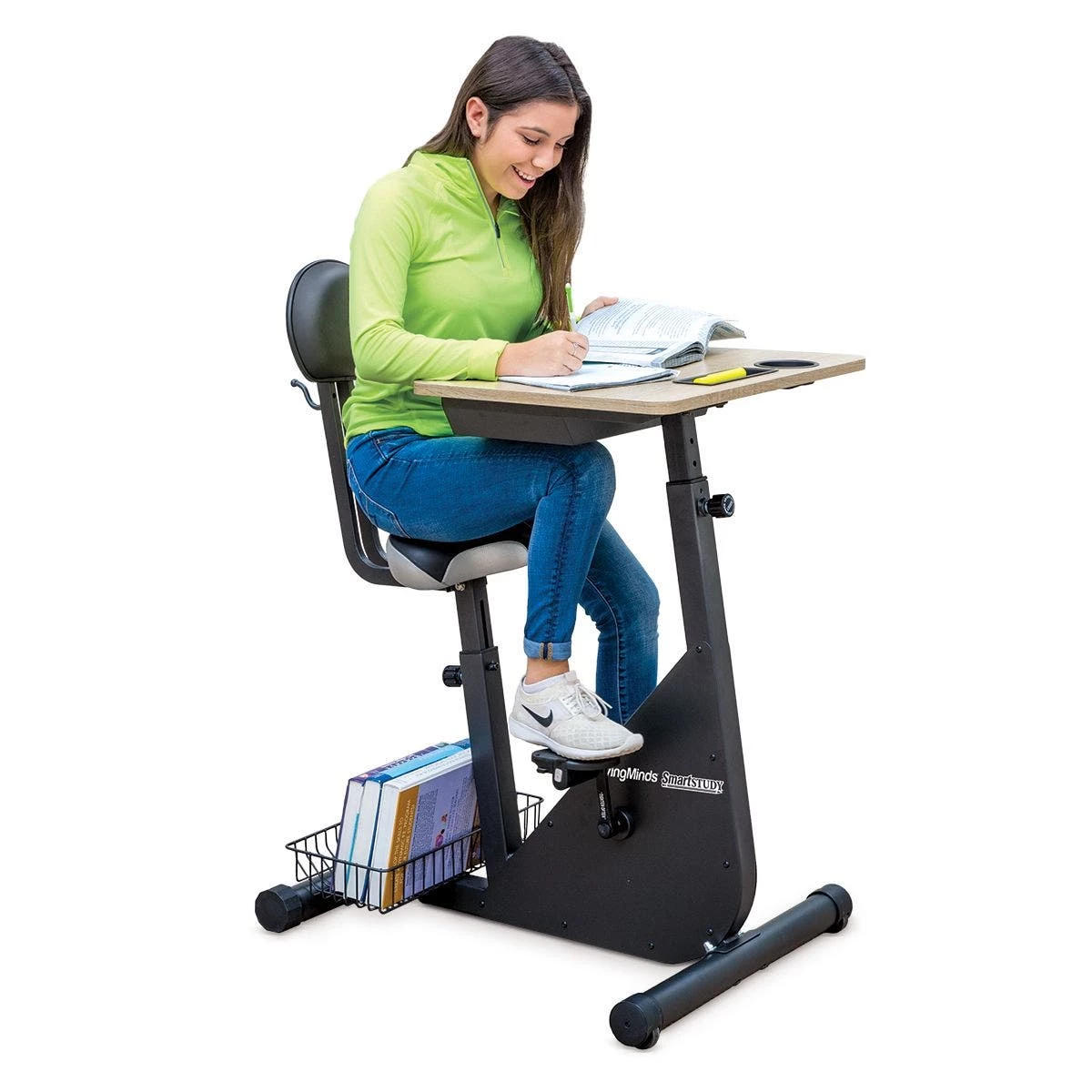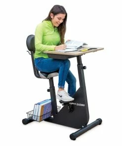 Pedal system is built into the desk, keeping activity on-hand at all times for students. A single-pulley system provides slight resistance so students can work off excess energy during class and stay focused. Powder-coated steel frame lasts for years and adjusts 33″-38”H. Cushioned seat adjusts from 23”-27”H. Sleek, durable melamine top provides a high-end, lasting look. Multiple storage options for pencils, a water bottle, books, and a backpack keep everything organized and ready for use. Overall desk: 38”L x 25-1/2”W; 59 lb. Desktop: 24”L x 18-1/2”W. Desk is designed for students under 5’H and supports up to 150 lb.