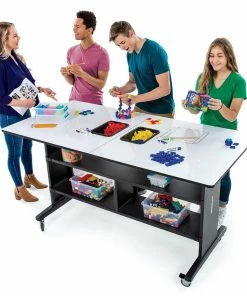 Students can gather around the table to brainstorm and write on the dry-erase half, while others build projects and perform experiments on the melamine half. Two storage bins (11″L x 5″H) built into the top let students store small items, while shelving under the desktop provides more room for additional supplies. Table includes a strong power-coated steel frame and four 3″ dia casters (two locking).