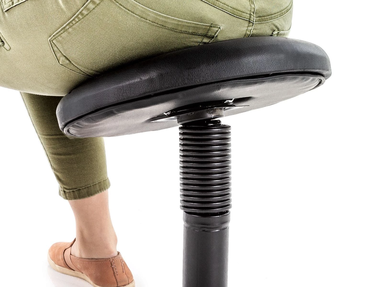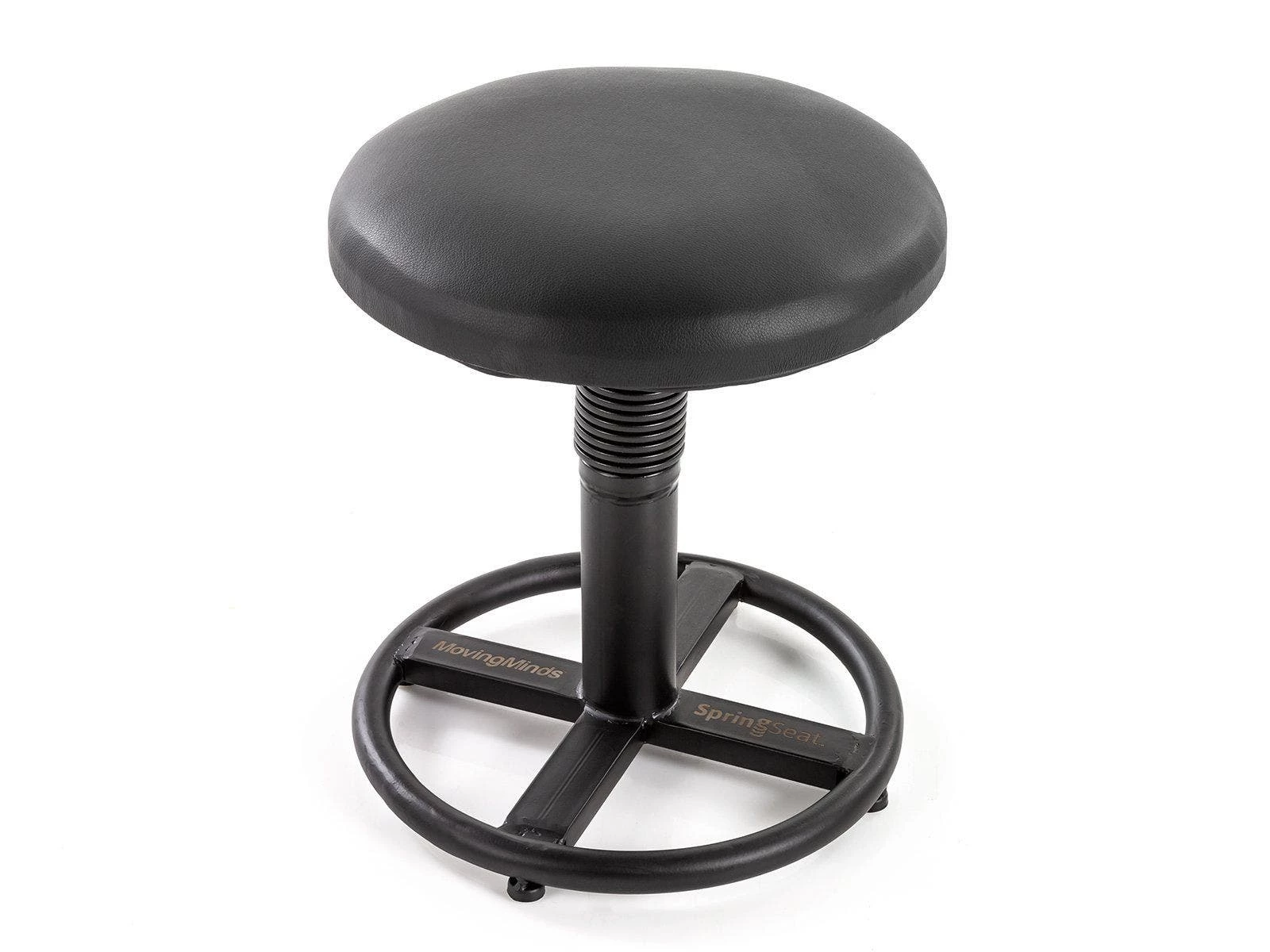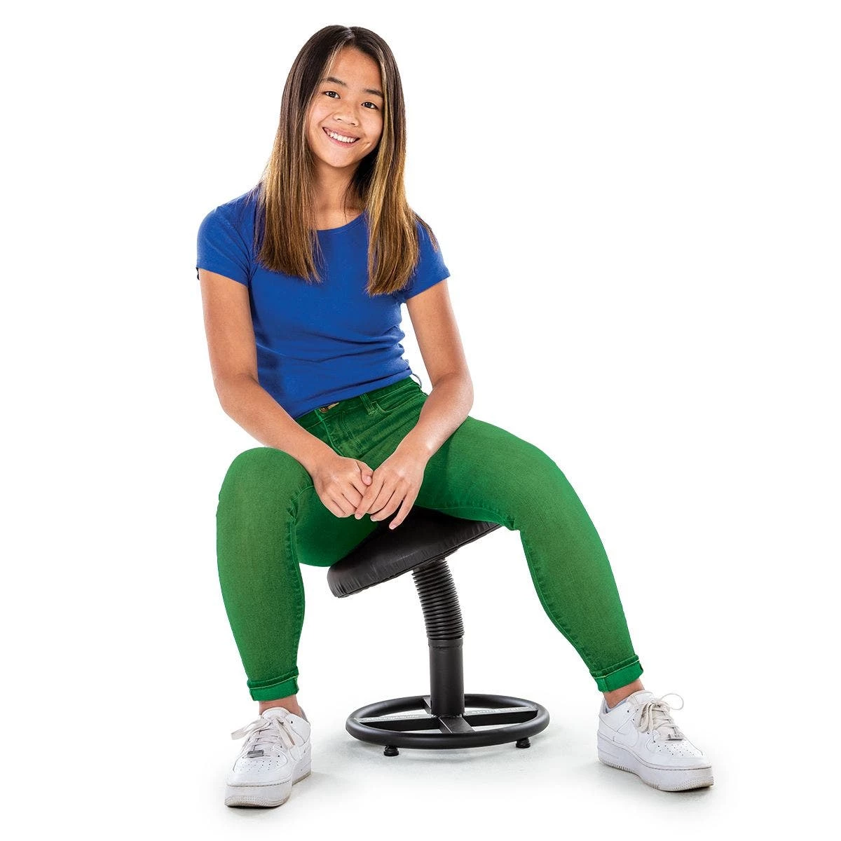 A spring built into the center post of these stools lets students tilt slightly in any direction, while the base stays firmly in place on the floor. A cover over the spring prevents it from pinching fingers. The soft, vinyl-covered foam seat is comfortable and spins 360°, allowing students to twist from side to side. The combination of tilting and spinning helps students build strength in their core as they balance, while the backless design encourages them to sit up straight and work on their posture while seated. Plus, the consistent movement lets them fidget and release excess energy. Supports up to 200 lb. Available in a Set of 6 and individually. 14″ dia base, 14-3/4″ dia seat. 14-3/4″H; 10 lb.
