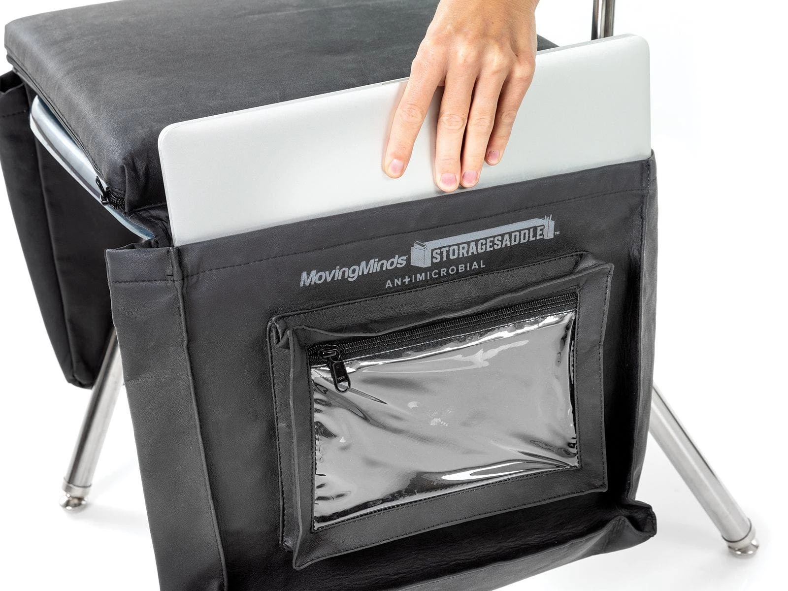 Instantly add storage and comfort to any secondary school chair with hanging pockets connected to a foam cushion. Simply drape pockets over the sides of an existing chair with the cushion on top. Folders, notebooks, and textbooks stay out of the way in each pocket to reduce clutter and distraction, but are always within reach when needed! Additional pencil pocket keeps writing utensils handy at all times. Lightweight yet durable polyurethane cover is antimicrobial and easy to fold up for compact storage when not in use. Non-slip bottom keeps cushion in place during use.