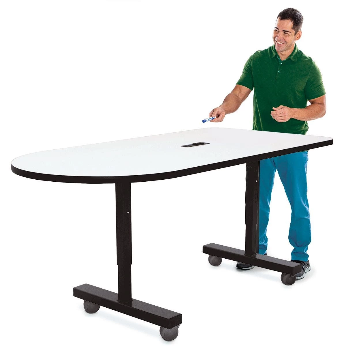 Adjustable legs allow for sitting or standing to incorporate more physical activity into the classroom. Table glides on 3” dia casters for quick transportation and easy transition between activities, or just to find a quieter place to work. The height adjusts from 24-36”H. Choose 60”L; 100 lb or 72”L; 130 lb.