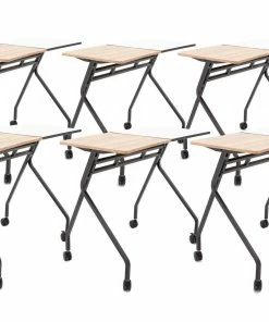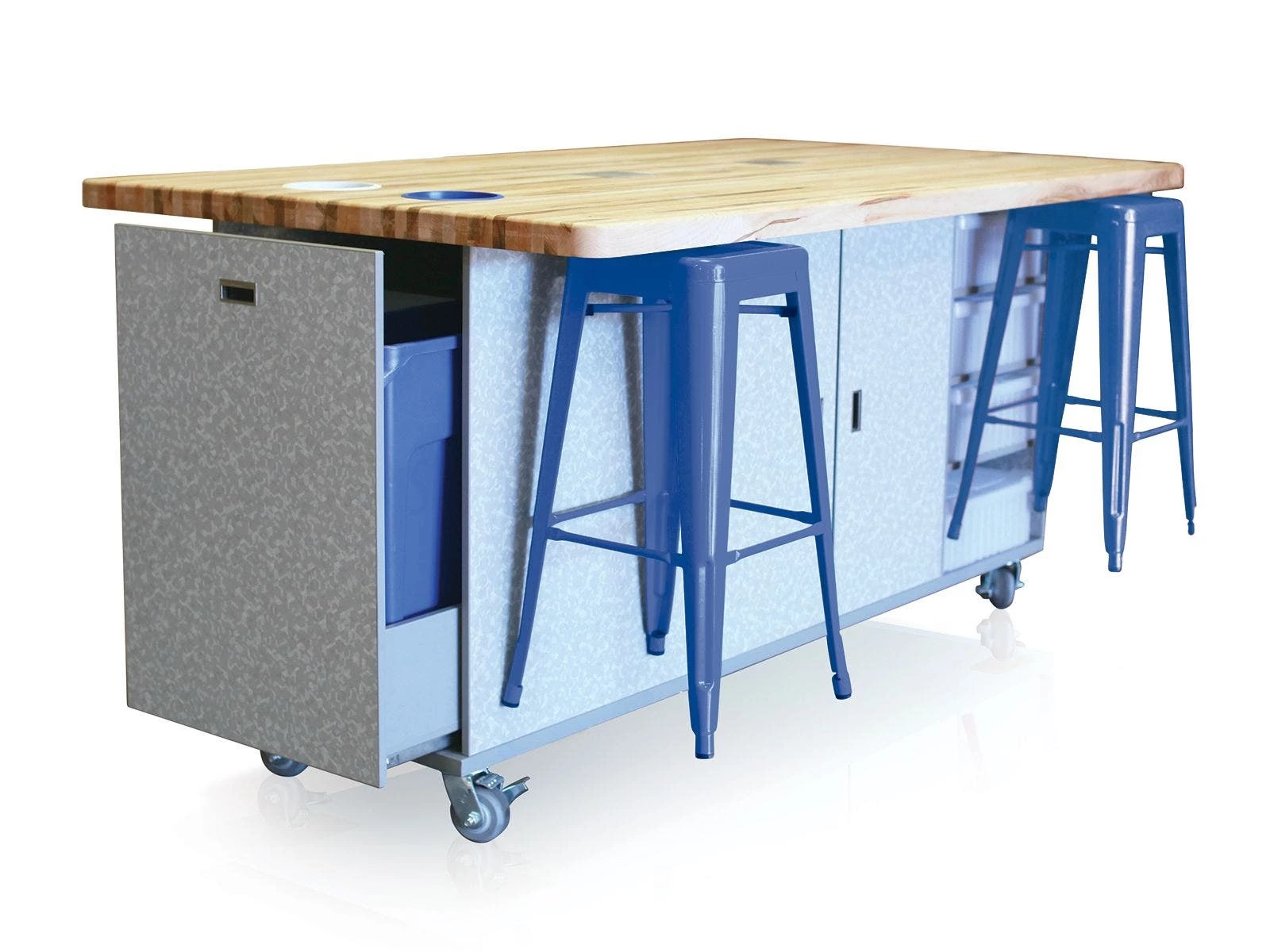 Table includes 6 magnetic stools that snap to the underside of the butcher block top when not in use, remaining raised up for effortless transportation and cleanup. Tables are 84”L x 48”W. Choose Compact (36”H; 500 lb) or Standard (42”H; 540 lb) to match the needs of your class.