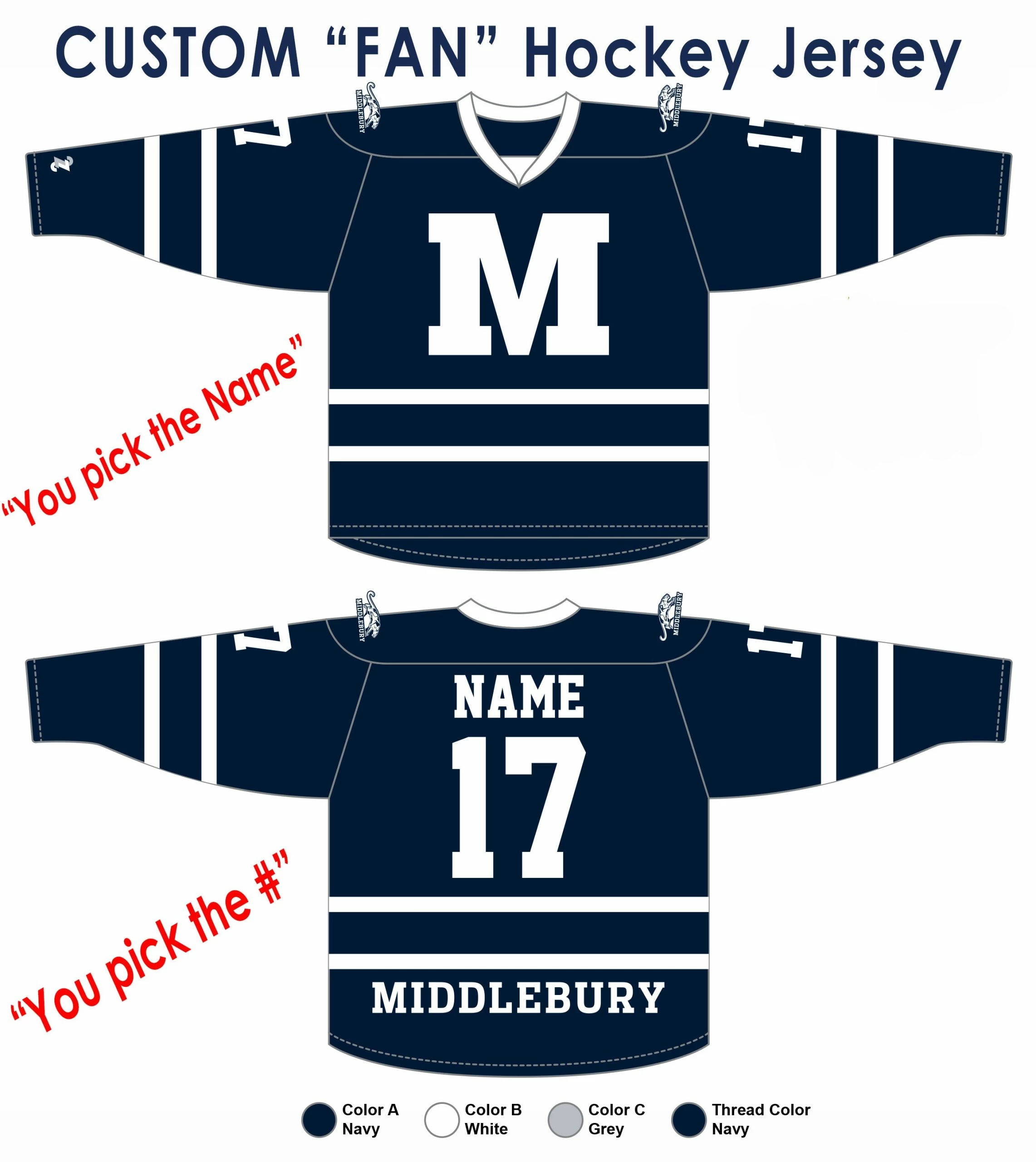 Full Custom Middlebury Hockey “FAN” Jerseys:Â Â You pick the NAME & NUMBER.