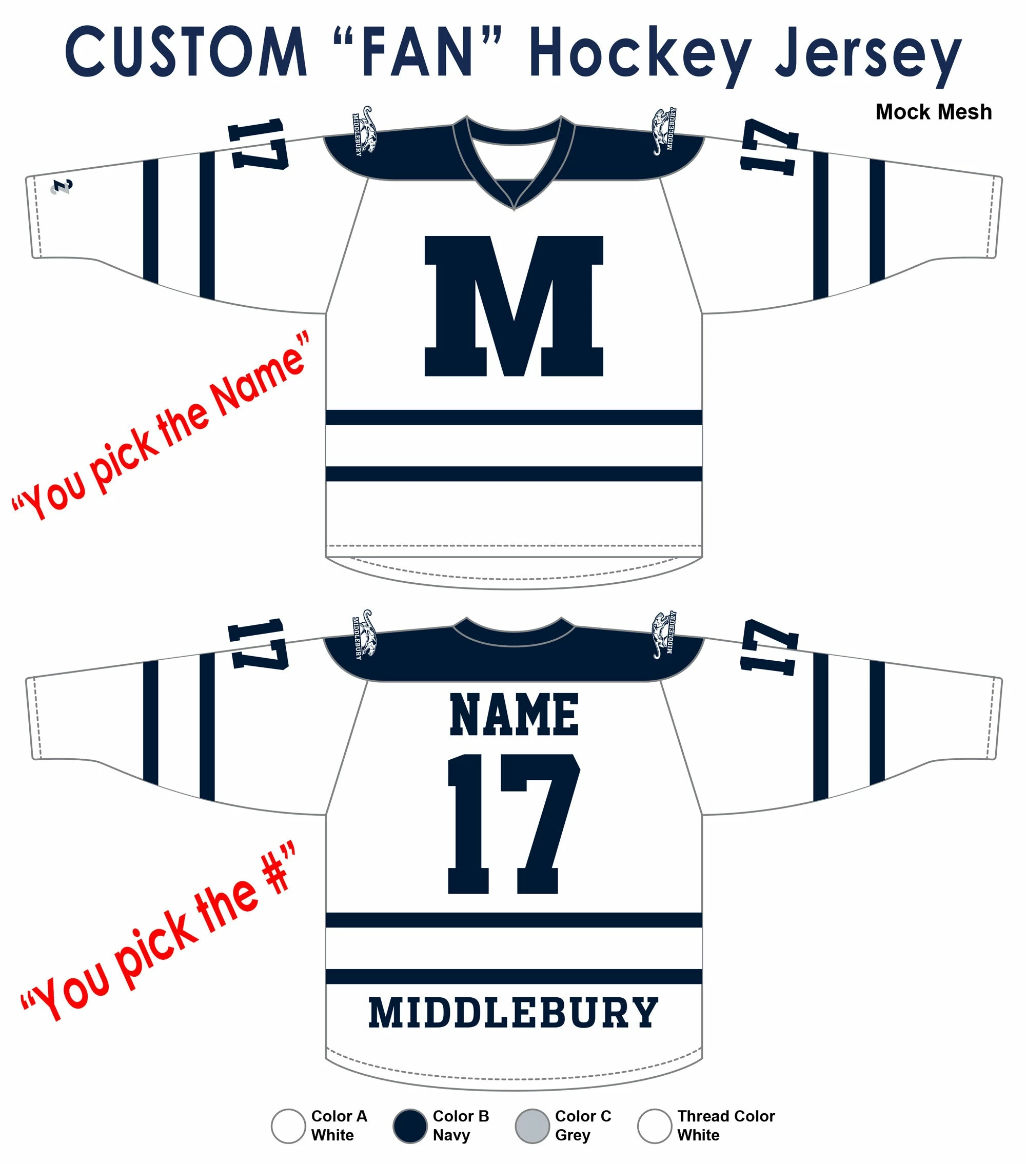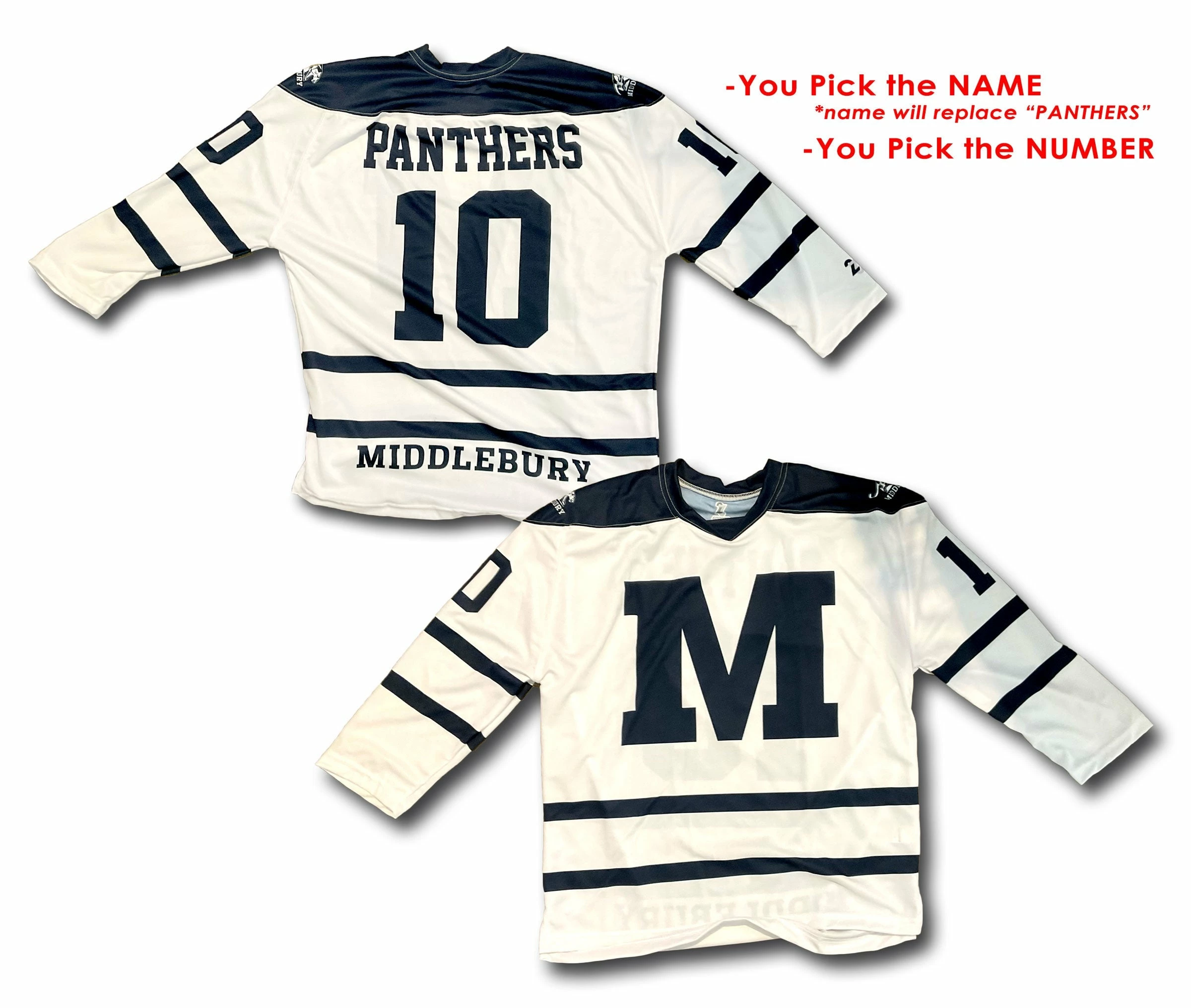 Full Custom Middlebury Hockey “FAN” Jerseys:Â Â You pick the NAME & NUMBER.