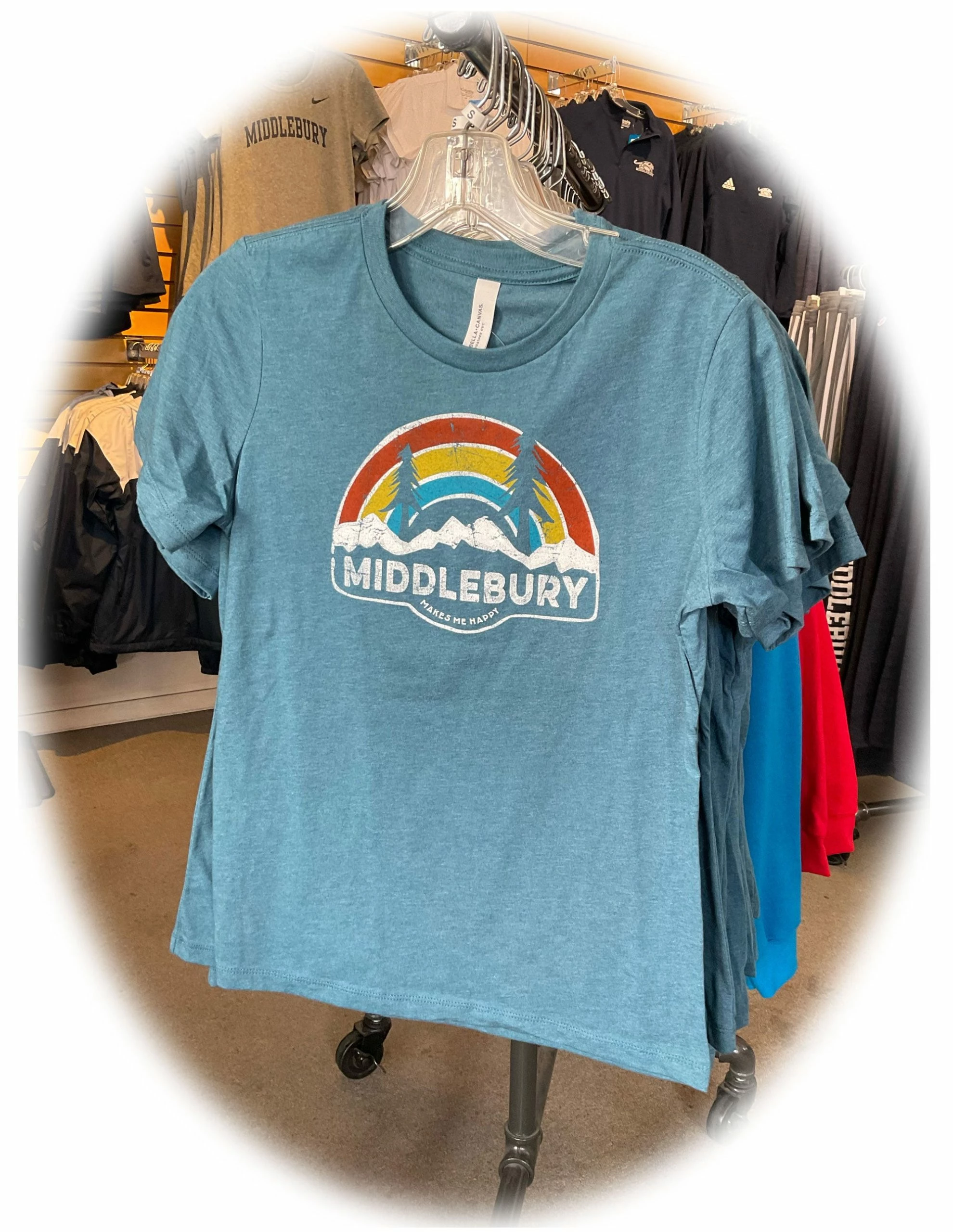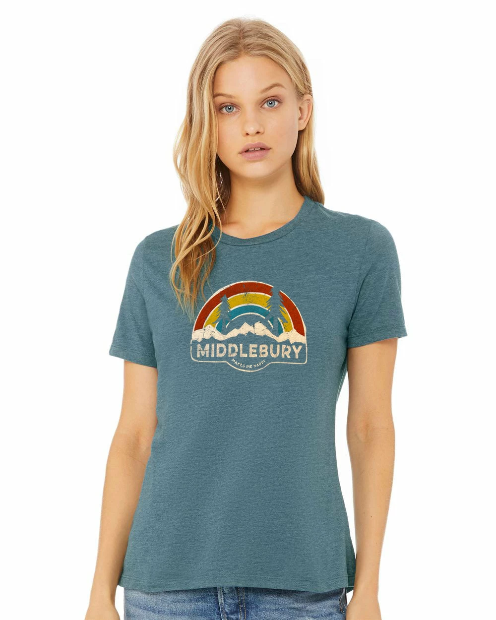 Bella & Canvas Ladies’ Relaxed Fit T-Shirt the the “Middlebury Makes Me Happy” Rainbow Logo.