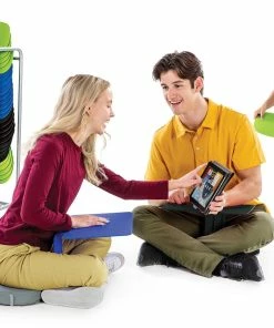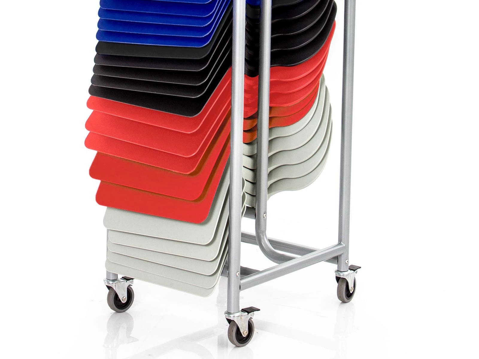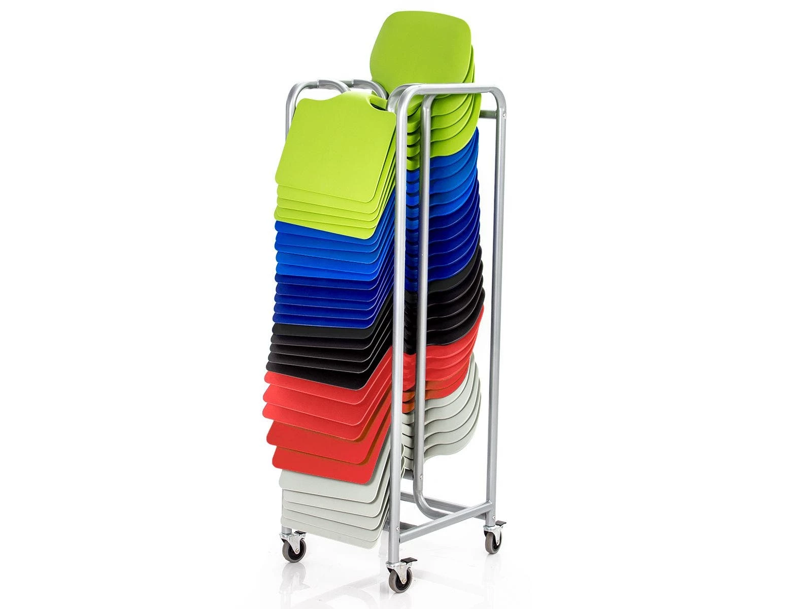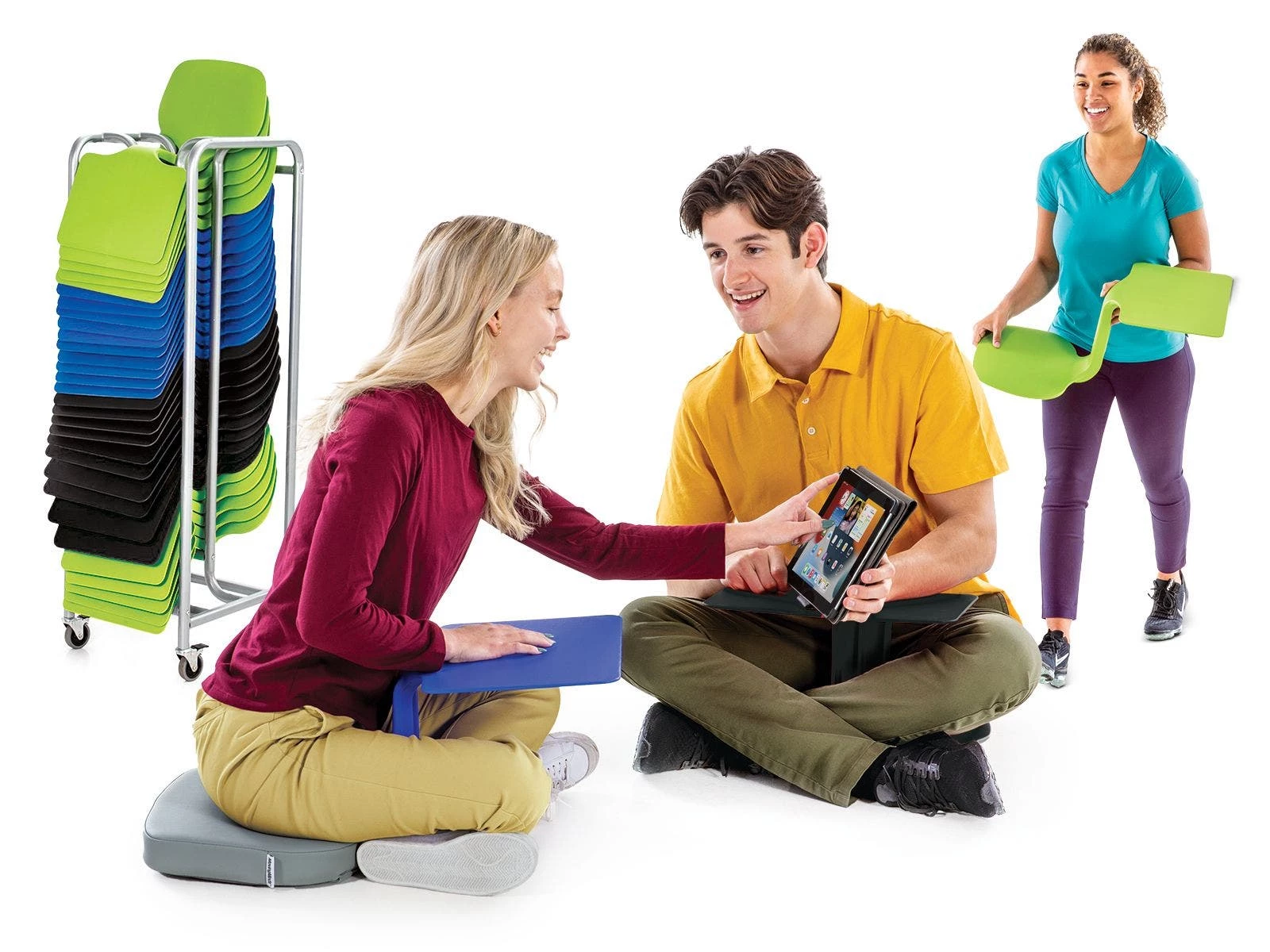 Whether reading on the floor or studying on the playground, the whole class can focus on the go with these durable floor desks. Lightweight, one-piece design is easy to carry and 11” x 14” textured desktop provides a sturdy place for a notebook, tablet, or other gear. When class is over, vertically stack floor desks on a specially designed powder-coated steel cart with 4 locking casters. Each desk supports 200 lb. Complete Set includes 30 floor desks (10 ea Blue, Green, Black) and a custom storage cart that stacks chairs vertically for compact organization. Durable metal construction and wheels allow for easy transport do and from storage or between classrooms. 20”L x 17”W x 54”H; 39 lb. Cart is also sold separately.
