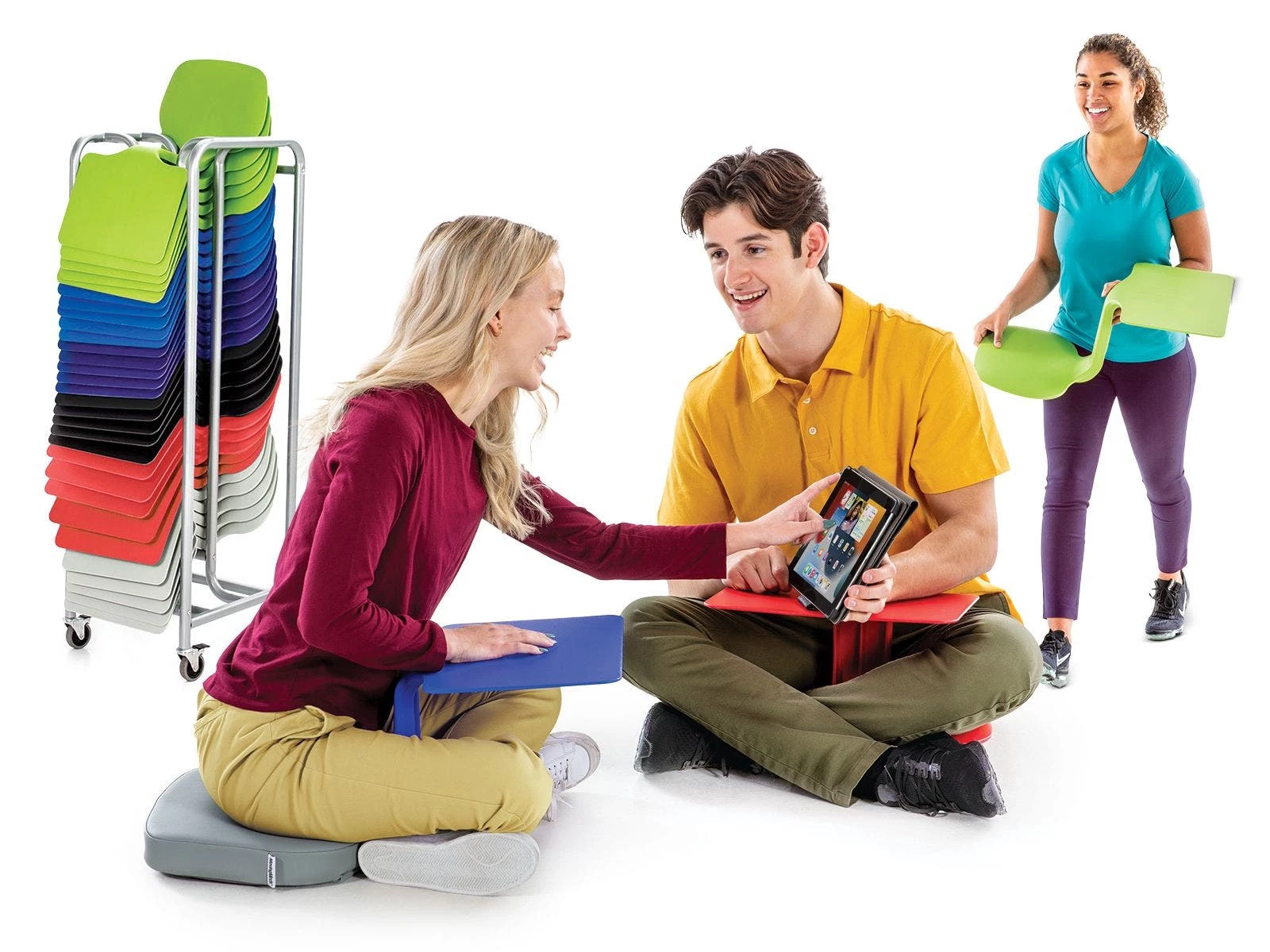 Have a writing surface wherever you need it with the Surf Floor Desk. Sit on the floor indoors or on the lawn outdoors, and study alone or discuss assignments in limitless group seating arrangements. Students sit on the seat and then place their book, papers, or tablet on the 11” x 14” textured desktop. The unique design combines a seat with a desktop in one seamless shape so students can use it anywhere! When students sit on the seat, the desktop becomes anchored for a sturdy work surface. The Surf is a durable addition to your repertoire of flexible seating. Each lightweight unit is easy for students to carry and stacks for convenient storage. Polypropylene plastic lasts under institutional use. Available in single color Sets of 10, Set of 6 (2 ea color), or individually. Seats support up to 200 lb. 24”L x 14-1/4”W x 11”H; 3-1/2 lb.
